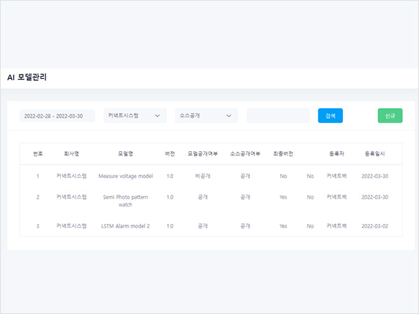 반도체 및 디스플레이 공정의 수율 분석 및 이상 감지를 위해서 고객사에서 개발한 AI 모델에 대한 내용 등 상세 정보 및 모델, 모델코드를 저장하고 관리할 수 있는 기능을 제공