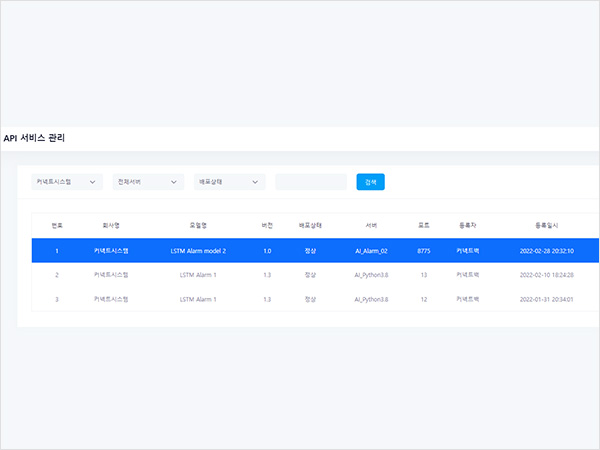 등록된 AI 모델을 Rest API 서비스로 배포하여 필요한 업무 시스템에서 호출하여 사용 할 수 있도록 하기 위하여 인공지능 모델 서비스 배포 및 관리 기능을 제공